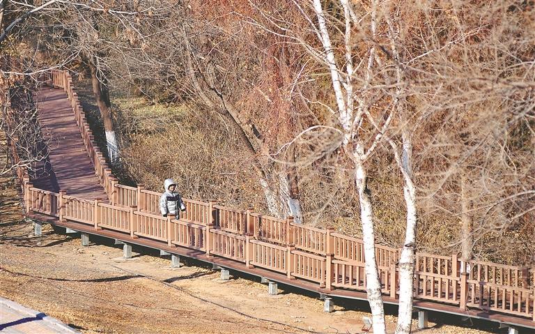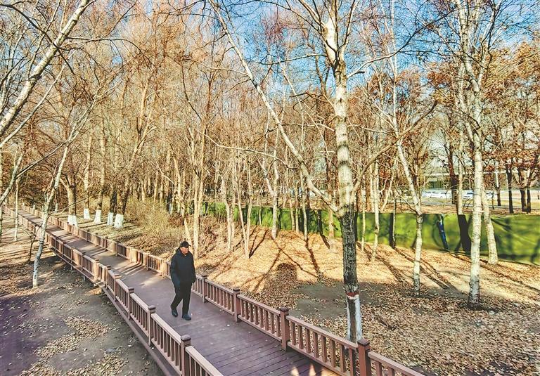 曲折蜿蜒的棧道穿過一片松樹林和白樺林,景色很美??拷罔F站一側(cè)設(shè)有休閑座椅和觀景平臺(tái),方便人們休息、賞景。